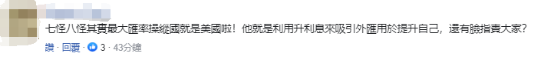 有網友認為美國才是最大匯率操縱國:“七怪八怪其實最大匯率操縱國就是美國啦!他就是利用升利息來吸引外匯用於提升自己,還有臉指責大家?”