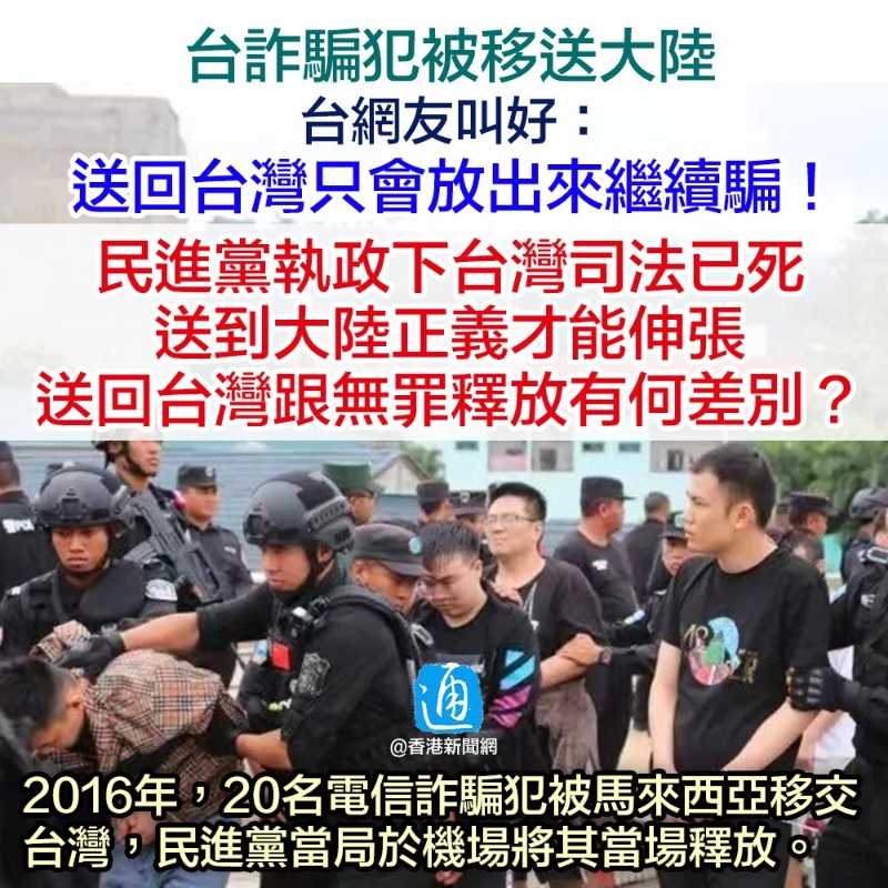 不過,台灣民眾似乎更希望詐騙嫌犯留在大陸受審。 “千萬別送回台灣,這是全民共識。”有台網友指,“對岸會重判,送回台灣關沒幾個月就放出來繼續騙!”有網友稱“送到大陸正義才能伸張,送回台灣跟無罪釋放有何差別?”“之前詐欺犯引渡回台,結果機場釋放!” 2016年,20名電信詐騙犯罪嫌疑人被馬來西亞移交台灣,民進黨當局僅在機場對其進行簡單詢問,便以證據不足無法取得起訴書為名,將20名嫌疑人當場釋放。事件引發輿論嘩然,台網友斥:“台灣已成詐騙犯的天堂。” 台前“立委”郭正亮早前分析指出,台灣犯罪成本太低,“台灣詐騙犯有20萬人,但詐騙罪很輕,加上島內監獄容量小,也找不到地方蓋監獄。從2004年到2015年從海外遞解回來有三四千人,但被判刑的只有500人,即使被判最多也就一兩年,釋放後繼續去詐騙。” “台當局只會炒作選舉,對詐騙束手無策。”台網友怒斥,“犯罪不用關,殺人免重刑,台灣已經是罪犯天堂了。”更有網友直言,“在民進黨執政下台灣司法已死,希望全台重大刑案罪犯都能遣送對岸處理。” 【編輯:張琦】