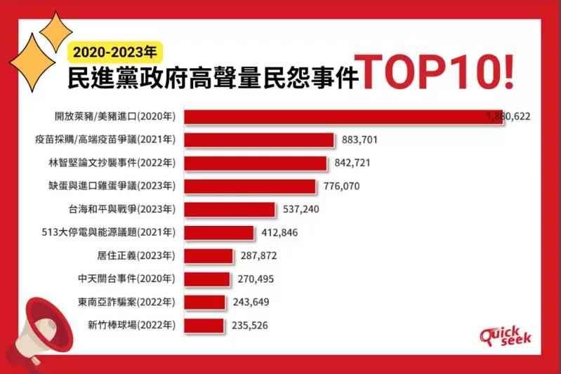 香港中通社11月30日電 台北消息:有輿情分析機構針對2020年到2023年民進黨執政期間發生的爭議事件進行大數據分析,整理出十大高聲量民怨議題,其中第一名為“開放萊豬進口”。而監督炮火猛烈的,大部分為中國國民黨立委。