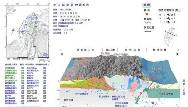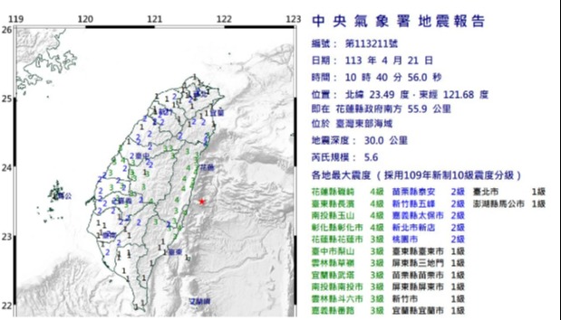 各地測得最大震度花蓮縣和平、宜蘭縣澳花皆為4級,而南投縣為2級,台中市、桃園市、新北市、新竹縣、台北市分別為1級。(完)