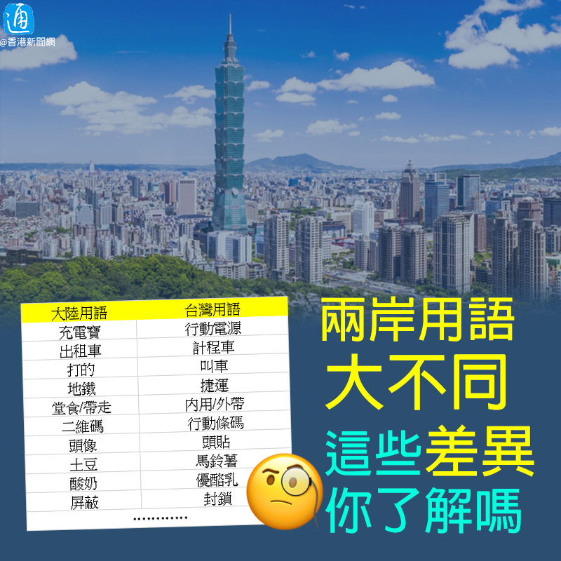 香港新聞網6月5日電 两岸三地在民間一直維持熱絡交流,不少台灣民眾前往大陸旅行、創業、定居等。儘管兩岸同講一種語言,但難免會因用詞習慣不同導致溝通不暢,香港新聞網盤點兩岸習慣、用語等差異,以增進相互了解。 早前一名來自上海的模特小姐姐在社交媒體發布視頻,總結其在台灣生活後發現的兩岸不同之處。第一,吃飯的時候,台灣店員會問“內用還是外帶”,而大陸及香港一般說“堂食或者帶走”;第二,在台灣點單時,店家會遞上一隻水彩筆讓顧客自己在菜單上寫,手機掃碼點餐相對較少;第三,買單時,台灣店員會問顧客要不要“載具”?大陸小姐姐直言,第一次聽到“載具”時一頭霧水,完全不知道對方在說什麼。熱情的台灣網友則在評論區解疑答惑,稱“載具”是用來存電子發票的,若說不用“載具”,店家就會給發票紙本。網友還補充,若店家問要不要“統編”,即是“公司報銷小票”的意思。 該名小姐姐接著說,地鐵在台灣稱為“捷運”,且每條線路的進站音樂都不同,“還蠻好聽的。”她還留意到台灣街上是沒什麼垃圾桶的,表示這點很佩服台灣人的素質。 除此之外,兩岸在一些生活用語方面也存在差異。比如,台灣橫的是列、豎的是排,大陸則橫的是排、豎的是列;台灣所稱的土豆指的是大陸所說的花生,而大陸說的土豆則是台灣所稱的馬鈴薯。在交通用詞方面,台灣的“叫車”、“單車”、“公車”,大陸是稱“打的”、“自行車”、“公交”。另外,台灣的“行動電源”在大陸稱作“充電寶”,台灣的“列印”、“影印”,大陸叫做“打印”、“複印”。
