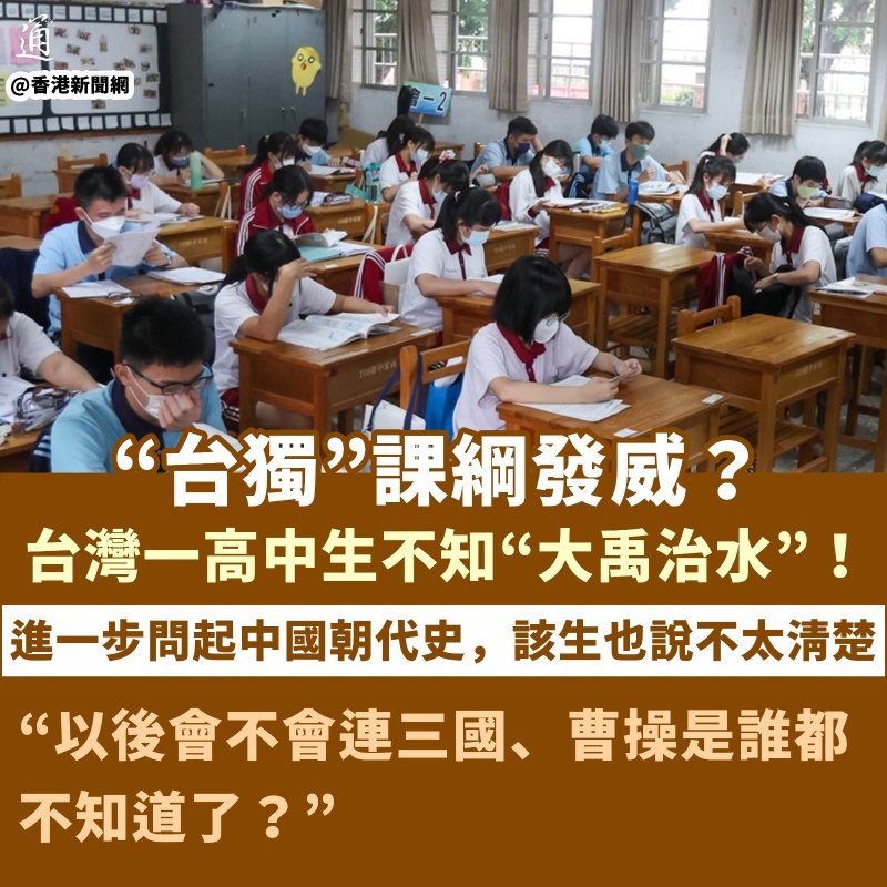 香港新聞網6月18日電 “108課綱”發威了?有台灣高中生竟不知“大禹治水”…… 台“中時新聞網”援引《聚傳媒》報道稱,一名台灣學生家長透露,自己的小孩就讀於台北市一所公立明星學校,16日午後下起大雨,於是跟小孩聊起“大禹治水”,沒想到小孩完全不知道“大禹治水”一事,也沒聽過大禹,進一步問起中國朝代史,小孩也說不太清楚。家長聽後頗為震驚,不禁質問是不是“‘108課綱’在發威?” 此事迅速在台灣引起熱議,不少民眾感嘆“以後會不會連三國、曹操是誰都不知道了?” “講中文不知道中國史也是蠻奇怪的!” 還有民眾追其禍源,稱 “民進黨要百姓學什麼,百姓就學什麼!根本就是在荼毒下一代!” 值得一提的是,近日,一段針對台灣學生的街頭採訪視頻登上了熱搜。在被問到考試中有關中國史的內容時,有考生表示“中國史就一兩道題”,甚至還有考生反問“中國史是什麼“,引發輿論爭議。有學生就此痛批民進黨當局課綱漏洞百出,並指出自己就是這種有諸多弊端的課綱的受害者。