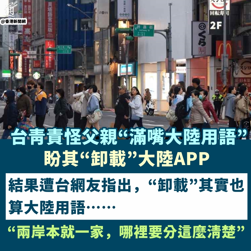 香港新聞網7月12日電 台灣一男子因父親沉迷大陸社交平台、滿嘴“大陸用語”而心生不滿,盼其“卸載”大陸APP。結果遭台網友指出,“卸載”其實也算大陸用語…… 近年,大陸APP抖音及小紅書爆紅。台灣一名男子就在社交平台發文,稱自己的父親沉迷網絡,講話經常夾雜大陸用語,包括“充電寶(台灣稱行動電源)”、“視頻(台灣稱影片)”與“洗面奶(台灣稱洗面乳)”等,讓他難以接受。因此,他堅持父親要用“本土語言說話”,並應“卸載”大陸社交軟件…… 不過,帖文曝光後,不少台網友均指出該男子是在小題大做, “聽得懂就好,兩岸本就一家,哪裡要分這麼清楚”、“現在年輕人很愛用大陸用語”、“有些大陸詞語滿好用的,反而台灣習慣用語比較難表達相同的意思”。 也有網友點出,男子所說的“卸載”也是大陸用語,因為台灣一般用“刪除”,質疑他是“五十步笑百步”,明明自己也深受大陸影響還責怪自己的老爸。
