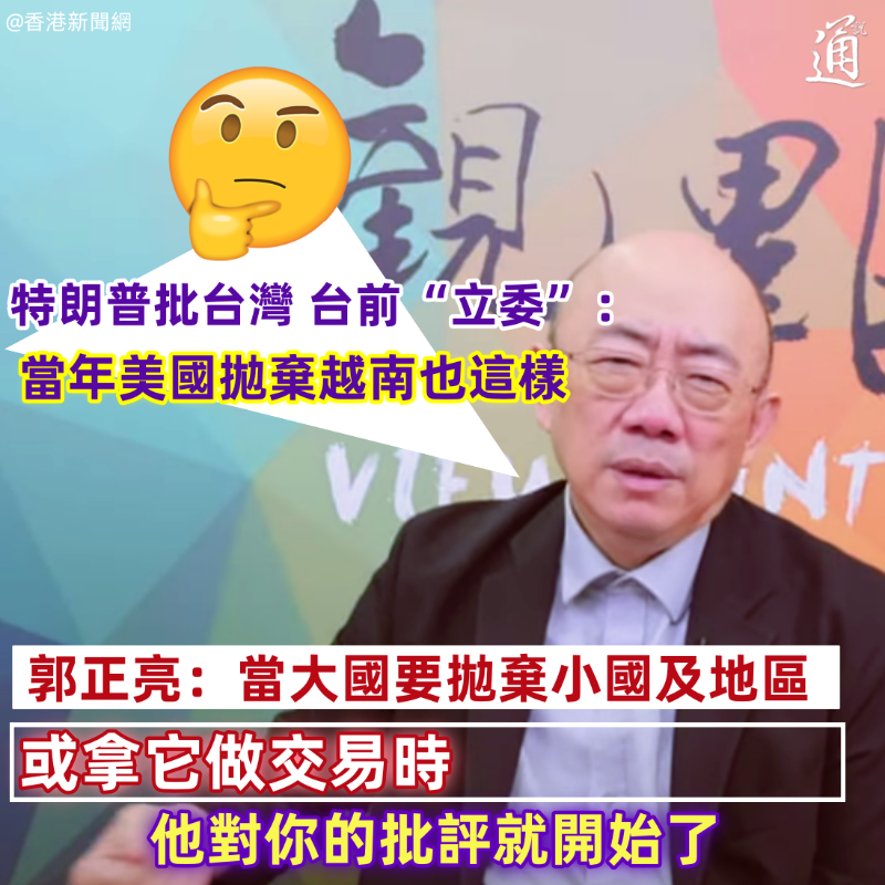 (香港新聞網製圖) 他舉例美國“拋棄”越南、烏克蘭都是先找理由。美國當年拋棄越南,就說“軍隊根本不能打仗,怎麼能怪我?我美國送給他一大堆軍備!”現時美國要拋棄烏克蘭,也抖一些黑料了。近期一篇文章就說,烏克蘭總統澤連斯基越來越暴躁,都不聽下屬的話,只要下屬講話跟他不一致,他就陷入暴怒。 “連領導人都批評進去了!”郭正亮稱,軍品盜賣也早就公布了,烏克蘭的人都外逃,結果徵兵不順、找不到軍人。“你看美國都在找理由!” “他說台灣搶走了美國百分之百的晶片工作、事業,”郭正亮認為,特朗普是要塑造一種輿論、渲染台灣的負面部分,到時候就可以說,美國沒有欠台灣,是台灣欠了美國! 郭正亮稱,特朗普開始批評台灣,說“保費繳得不夠”、害了美國的晶片事業,都是在找理由。他喊話台灣民眾,準備接受“大交易時代”的來臨! 台灣一些民眾日前接受台媒街頭訪問時則質疑:美國也沒有提供什麼“保護”,憑什麼收保護費呢?(完) 【編輯:刘春】