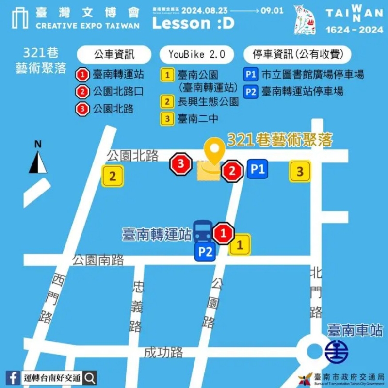 據台灣《聯合報》報道,2024台灣文博會台南概念展區大眾運輸交通資訊如下:校本部位在321巷藝術聚落,鄰近公園北路站、公園北路口站、台南轉運站,建議從台鐵台南站搭乘0左、0右、7、21、88、橘3、橘11至公園北路站。 漫畫校區在西竹圍之丘文創園區,鄰近台南一中站、勝利大學路口、成大光復校區站、香格里拉飯店站,建議從台鐵台南站搭乘6、70、紅1至台南一中站。 文創校區在藍晒圖文創園區,鄰近新光三越新天地站、小西門(大億麗緻)站、永華站,建議從台鐵台南站搭乘1、2、5、11、18、綠17、紅幹線、紅2至新光三越新天地站。 YouBike站,在321巷藝術聚落:鄰近台南公園(台南轉運站)站、長興生態公園、台南二中;西竹圍之丘文創園區:鄰近成大公園站、馬雅各青年公園站、台南一中;藍晒圖文創園區:鄰近水萍塭公園(夏林路)站、小西門公園站。 停車資訊,321巷藝術聚落:鄰近市立圖書館廣場、台南轉運站停車場; 西竹圍之丘文創園區:鄰近民族路停車場、前鋒路停車場、大學路(社E1)停車場、大學路(社E2)停車場、大遠百停車場、台南南一停車場、民族路一段停車場。 藍晒圖文創園區:鄰近水萍塭公園地下停車場、台灣聯通台南大德停車場、台南海安路一段停車場、城市車旅國泰置地站停車場、新光三越台南西門分公司停車場、新光三越二館停車場。