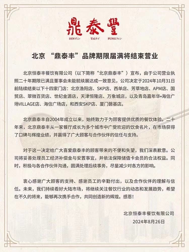 北京恆泰豐餐飲有限公司表示,“自2004年成立以來,始終致力於為顧客提供優質的餐飲體驗。20年來,北京鼎泰豐從一家餐廳成長為多個城市中廣受歡迎的飲食名片,在市場獲得了口碑與輝煌業績,並贏得了廣大顧客與合作夥伴的信任與支持。” 鼎泰豐總公司回應指出,鼎泰豐在大陸北京、天津、青島、廈門、西安等城市分店,目前由北京恆泰豐餐飲有限公司經營,因北京恆泰豐餐飲有限公司營業執照期限屆滿不再展延,故鼎泰豐提前終止品牌授權。 鼎泰豐總部並表示,上述城市共14家分店,將陸續於2024年10月31日前結束營業。鼎泰豐總部已責請當地經營管理團隊,妥善處理員工經濟補償金與安置事宜,並依法保障儲值卡會員的合法權益,未來將積極與各合作夥伴溝通,圓滿處理後續事務,盡量減少對各方的影響。 鼎泰豐總部另強調,鼎泰豐在大陸其他城市分店(上海、蘇州、無錫、南京、嘉興、杭州、寧波、廣州、深圳)經營管理不受影響,維持正常營運。感謝顧客長久以來的支持,鼎泰豐將持續致力於優質餐飲體驗,以期將來有機會再次於華北地區提供服務。(完) 【編輯:彭玉婷】