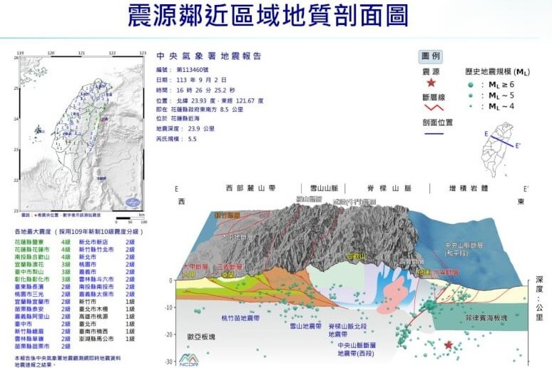 圖源:台灣災害防救科技中心LINE帳號 花蓮縣近海當天下午發生5.5級地震,震深度23.9公里,震央位於花蓮縣政府東南方8.5公里處,最大震度花蓮縣、南投縣4級。地震發生後,台氣象部門針對花蓮縣發佈“災防告警訊息”。 此次地震在全台18個縣市有震感,除花蓮、南投外,宜蘭、台中、彰化3個縣市的震感較為明顯。大陸福建民眾反映,廈門、泉州等地也有震感。 台氣象部門表示,此次地震為“4·3花蓮大地震”的餘震,震央與主震距離約12公里;由於主震產生的破裂區域地層需要較長時間進行應力調整,推測餘震活動會持續到主震後約3至6個月。 統計顯示,截至9月2日17時,“4·3花蓮大地震”餘震在6至7級的有9個,5至6級有87個,有感餘震共計1673個。(完) 【編輯:淩玉輝】