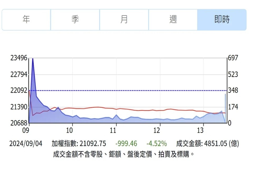 台灣證券交易所網站截圖 8月美國製造業數據疲弱,引發經濟降溫疑慮,加上傳出英偉達收到美國司法部傳票,面臨反壟斷調查,半導體板塊普遍下跌。其中費城半導體指數重跌399.82點或7.75%;英偉達暴跌11.37美元或9.53%;台積電在美信託憑證也大跌11.21美元或6.53%。 台股4日上午一開盤就探底,盤中曾大跌1170.04點,一度失守21000點大關。隨後跌幅雖然收斂,終場仍下跌999.46點,收在21092.75點。外資大舉撤離,單日賣超(賣出大於買入的金額)台股新台幣1007.51億元,創歷史新高。 三大權值股同步走弱,台積電終場大跌51元或5.43%,收在889元,失守900元重要關卡;鴻海挫5.5元或2.97%,收179.5元;聯發科也重跌85元或6.97%,收1135元。傳統產業股同樣全軍覆沒。 市場人士分析,根據過往經驗,第三季是美股走勢最弱的時候,且今年11月將面臨美國總統大選變數,短期市場波動可能較大。不過現在斷定台股會繼續下跌還言之過早,接下來美國將公布非農就業數據和失業率,這非常重要,將進一步確認美國經濟情況,並決定台股後續走勢。(完) 【編輯:淩玉輝】