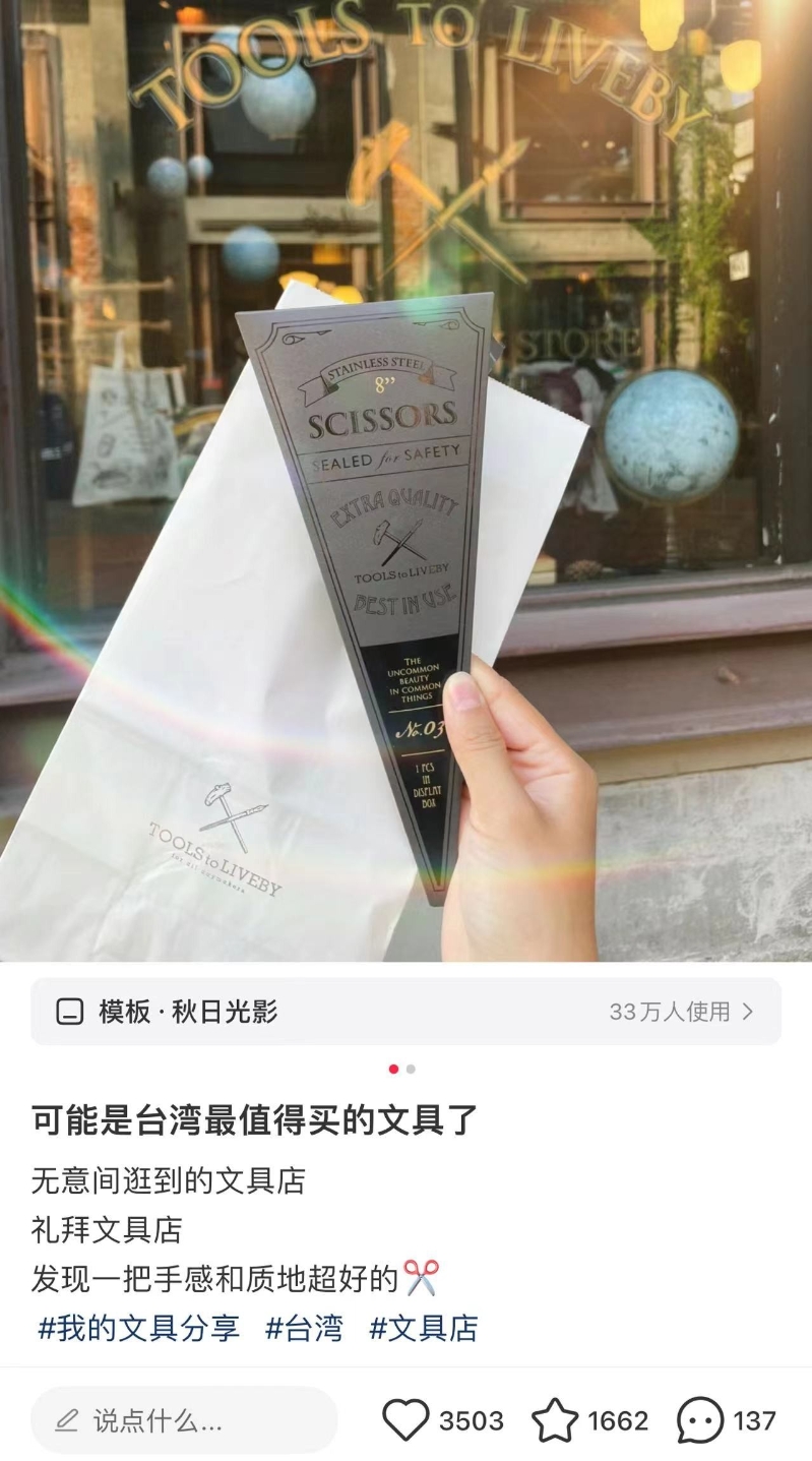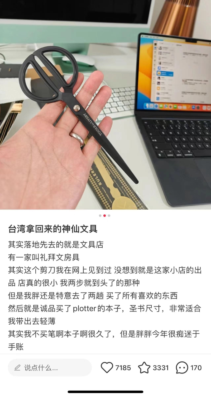 網友分享自己從台灣帶回來的“神仙文具”。(圖源:小紅書) 這篇分享引發了許多大陸網友的回應,大家紛紛分享自己也購買了同款剪刀,有人甚至一次收齊金色和黑色兩款。網友留言表示,“我也有這把剪刀,日常使用很方便,而且外觀也很好看”、“禮拜(文房具)的剪刀真的很棒,我用了十年依然如新”、“這家店的名氣很大,文具愛好者都知道”,還有網友提到日本和韓國的遊客也很喜愛這款剪刀,視為必買商品。