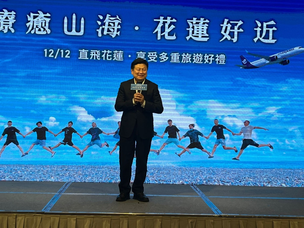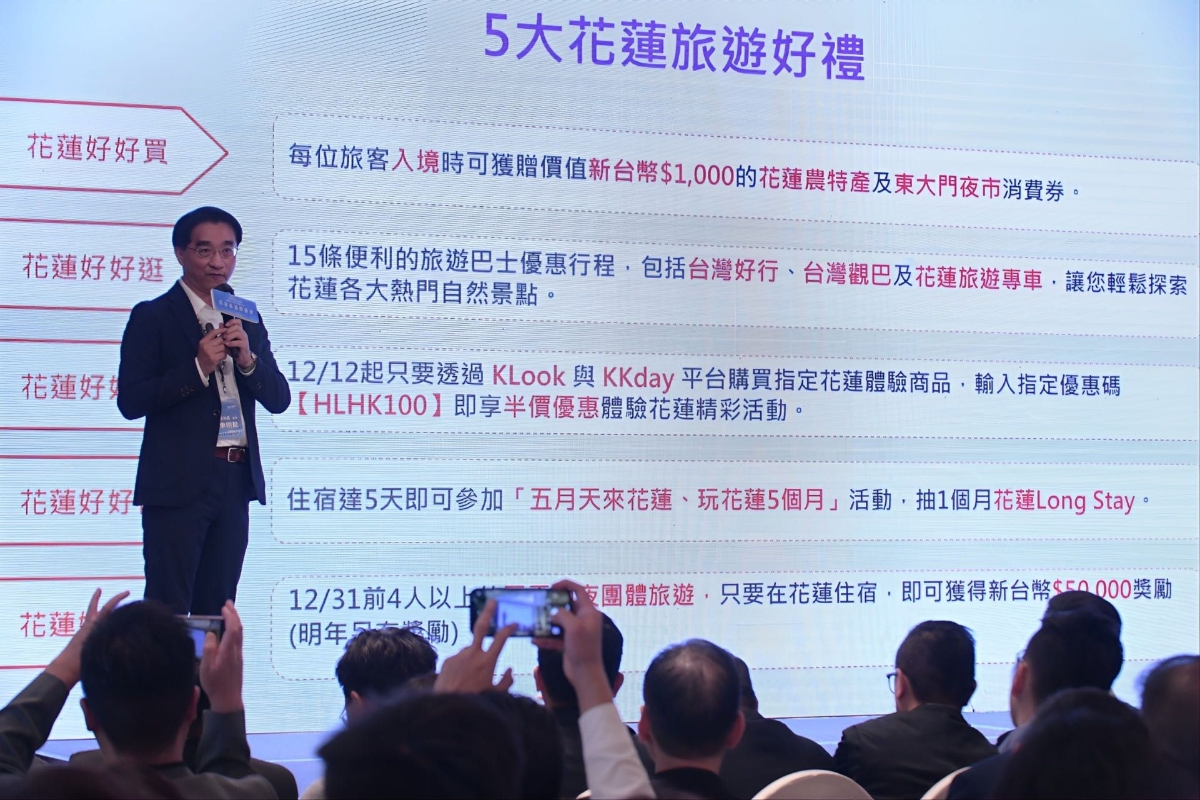 國民黨立法機構黨團總召傅崐萁介紹花蓮旅遊特色。(香港中通社圖片) 花蓮縣政府觀光處長余明勲表示,縣府特別推出超值“五大旅遊好禮”,讓香港遊客以優惠價格享受豐富完整的旅遊體驗,包括“花蓮好好買”提供搭乘直航航班的香港遊客新台幣1000元農特產及夜市消費券、“花蓮好好逛”提供14條旅遊巴士路線及優惠、“花蓮好好玩”體驗商品50%折扣、“花蓮好好住”於花蓮住宿達5天,即可參加“五月天來花蓮、玩花蓮5個月”活動抽獎,以及“花蓮好好遊”團體旅遊住花蓮獎勵5萬元等,搭乘12月12日首航的民眾更可獲得首航限定好禮。