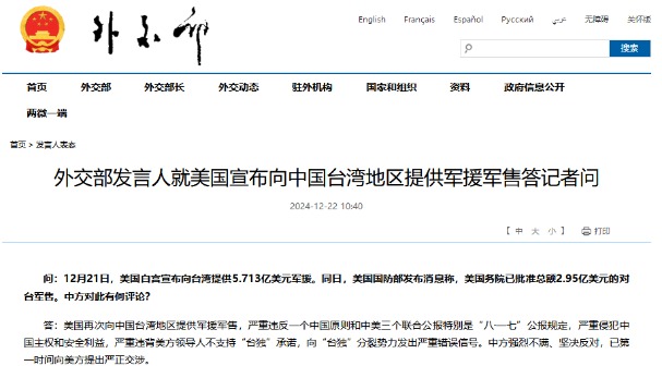 香港新聞網12月23日電 針對美國白宮於21日宣布向台灣地區提供5.713億美元軍援的消息,中國外交部發言人於22日表示,中方對此強烈不滿並堅決反對,已第一時間向美方提出嚴正交涉。專家指出,美方頻繁對台軍售主要是為了獲取“保護費”,而所謂的台軍裝備提升並無實際意義。 這是美國在今年9月後再次批出最大規模的對台軍援。同日,美國國防部宣布,國務卿已批准總額為2.95億美元的對台軍售。對此,外交部發言人重申,這一舉措嚴重違反了一個中國原則及中美三個聯合公報,侵犯了中國的主權和安全利益,違背了美方不支持“台獨”的承諾,並向“台獨”分裂勢力發出了錯誤信號。中方強調,台灣問題是中國核心利益中的核心,是中美關係中不可逾越的紅線。美方“以武助獨”只會引火燒身,“以台制華”注定不會得逞。中方敦促美方立即停止武裝台灣,避免危害台海和平穩定的行為,並表示將採取一切必要措施捍衛國家主權、安全和領土完整。