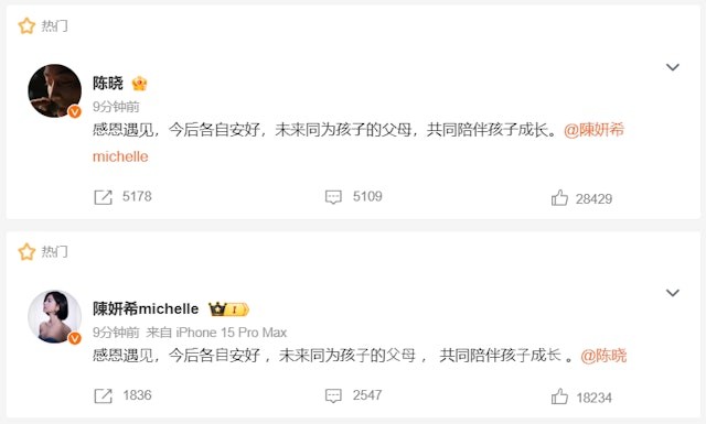 陳妍希和陳曉宣布離婚 《神雕俠侶》結緣感情時間線一文看香港新聞網2月18日電 大陸男星陳曉和台灣女星陳妍希在官方微博宣布離婚:感恩遇見,今後各自安好,未來同為孩子的父母,共同陪伴孩子成長。 2014年陳曉與陳妍希合作《神鵰俠侶》結緣,兩人在2015年承認交往,並於2016年結婚,目前育有一子。 有“大陸第一狗仔”之稱的卓偉1月30日曾曝光一段音檔,當時他稱陳曉陳妍希雖未離婚,“但已經分居一年多了!” 據悉,陳妍希與老公陳曉在2023年6月傳出婚姻亮紅燈,但她多次被發現手上仍戴有婚戒,用行動破碎婚變傳聞。但男方之後被發現沒有現身岳父的告別式、又以個人名義為西藏地震災區捐款,令離婚傳聞更甚囂塵上,近日他們又被發現微博IP屬地顯示在兩個城市,疑沒有一起過年,再次令大家更相信他們早已分道揚鑣了。