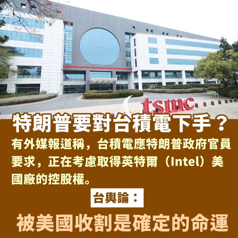 香港新聞網2月18日電 多次點名台灣“搶走”美國芯片生意的美國總統特朗普,要對台積電下手了? 近日,有外媒報道稱,台積電應特朗普政府官員要求,正在考慮取得英特爾(Intel)美國廠的控股權。具體如何接手,媒體傳出多個版本,包括英特爾拆分半導體製造部門,與台積電組成合資公司;台積電取得英特爾的控股權,但不取得經營權;《華爾街日報》釋出的最新的版本指出,博通 (Broadcom)和台積電將共同分拆英特爾,由博通吃下芯片設計部門,製造部門則交給台積電。 消息一出,引發輿論嘩然。有台媒直言,吞下英特爾這個“燙手山芋”是台積電“不可承受之重”。 台前“立委”蔡正元在參加一檔政論節目時就此事表示,只要看看俄烏衝突中美國如何吸血歐洲,就知道台灣的下場了。形容此舉是美國政府公然“搶劫”台積電。 “現在刀子已經架到台積電的脖子上了,台積電未來一定會變成‘美積電’,”蔡正元比喻,英特爾是美國的“親兒子”,台積電是“養子”,“養子”功課好,可以考上大學,“親兒子”書唸不好,便叫“養子”來當“槍手”,幫助“親兒子”考上大學。 他分析稱,若是“合資”,英特爾出設備、台積電出資金,那虧損全權由台積電負責。若不想虧損,台積電需要把工廠運營起來,勢必會進行技術轉移,台積電出錢出技術,美國這門生意穩賺不賠。 “那台積電有沒有可能不照做?”蔡正元哀歎,完全沒有。認為如果美國政府下狠手,勒令各國不准賣設備給台積電,台積電將束手無策。所以台積電被美國收割,是確定的命運。