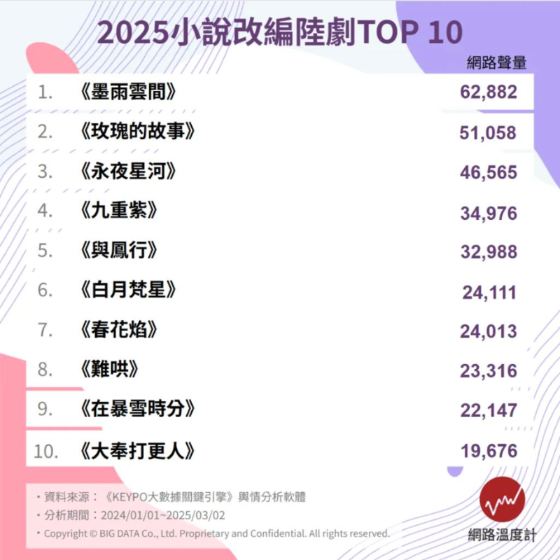 台灣“陸劇熱”延燒!台網盤點評出十大小說改編人氣陸劇香港新聞網3月10日電(編輯 丘志彬)又一部陸劇在台灣爆火!由小說改編成電視劇的《難哄》成為當下台灣島內最熱門的電視劇之一,“許多人都追得欲罷不能”。台灣“網絡溫度計 DailyView”近日關注到這個現象,根據島內人氣對近一年由小說改編的大陸電視劇進行了盤點。