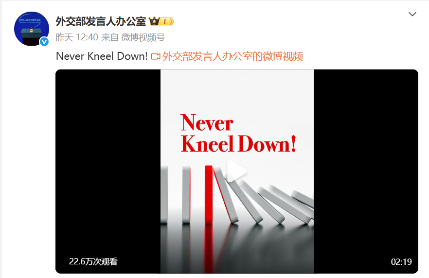 大陸發雙語硬核視頻《不跪!》 台輿論:向全世界表明態度分享到: