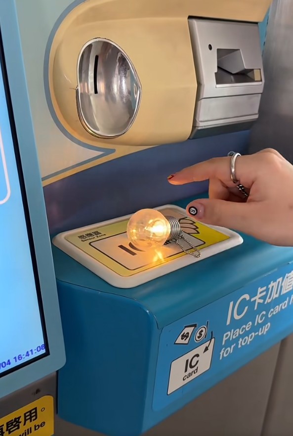 一位港碩在台灣旅遊期間,發現多款新奇有趣的悠遊卡。圖中燈泡造型悠遊卡會亮燈。(小紅書視頻截圖)