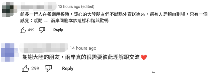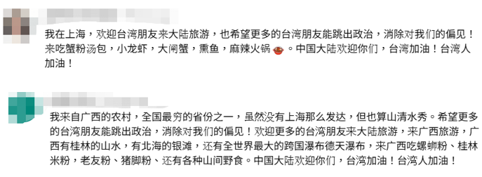 網友評論 在直播評論區,亦有大陸網友熱情推薦美食、美景,歡迎台灣同胞前來做客,跳出政治、消除誤解。