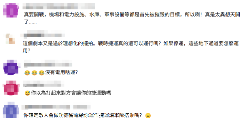台灣媒體亦指出,該演練科目有諸多可能風險待探討解決,例如城市電力系統遭癱瘓等高壓情境下,捷運系統能否持續發揮戰術功能有待商榷。 因此,島內輿論吐槽,這個演練科目脫離現實,簡直“異想天開”,並指出台軍演習就是“演戲”。網友建議,台軍與其演練搭捷運,不如練跑步,或者把捷運停運被甕中抓鱉的情形也演練一下。