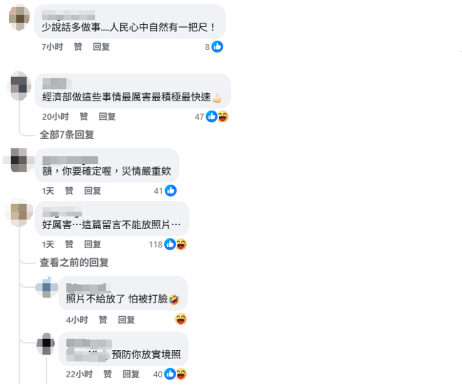 網友評論 “好厲害⋯⋯這篇留言不能放照片⋯⋯”有網友或是想甩出實景照片以戳破謊言,卻發現該臉書專頁限制了留言區發布圖片功能。“怕被打臉。”其他網友在該留言下方回覆,諷刺台經濟部門擔憂被揭穿真相,故提前“預防”。