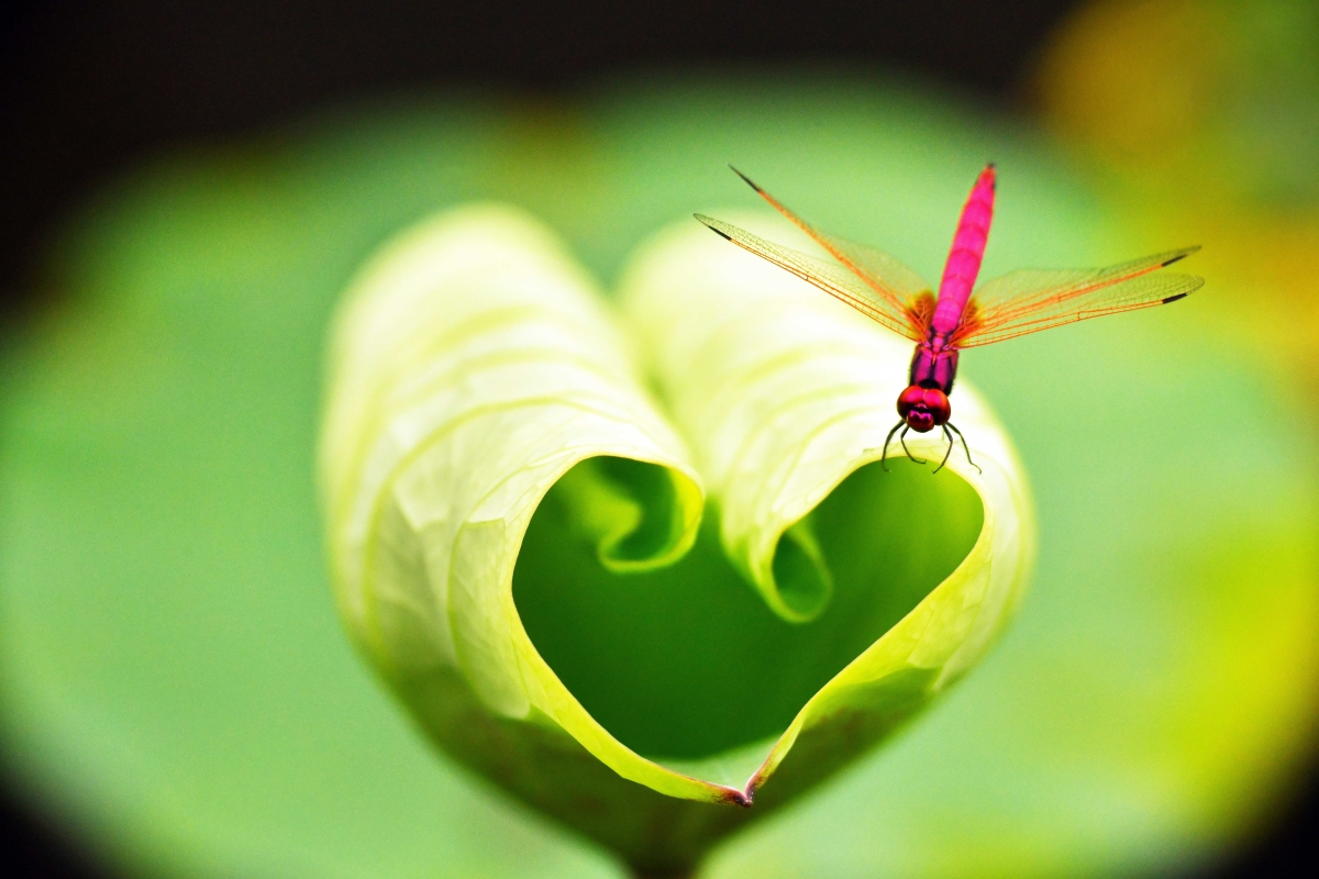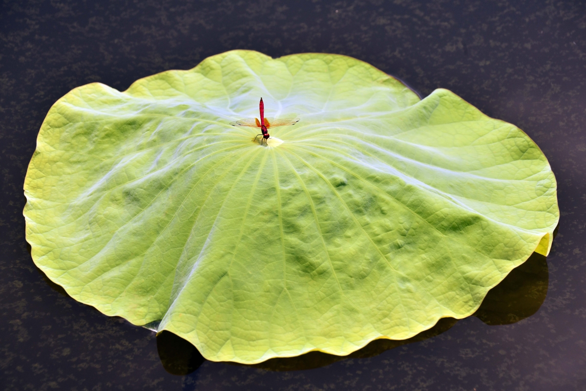 翠綠荷葉在成長中有各種姿態。這片心型的葉子,吸引紫紅蜻蜓來此倒立,散熱、避暑,傾聽荷心的聲音。