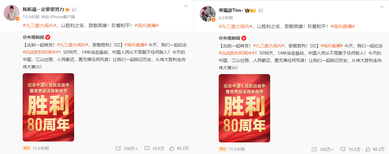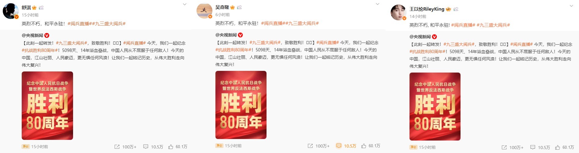 伊能靜表示:“珍惜來之不易的和平!” 吳慷仁表示:“銘記歷史、緬懷先烈、真愛和平、開創未來!” 林瑞陽則高喊:“一起見證九三盛大閱兵!正義必勝!和平必勝!人民必勝!”