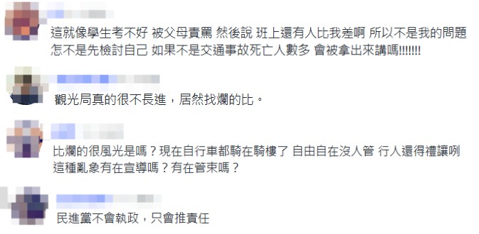 台灣《聯合報》也批評稱,“觀光署”官員的點評撈過了界,既畫錯重點,又得罪泰國。台灣觀光近年來表現差強人意,而泰國觀光排名一直名列前茅,台灣被外媒報道說交通差,竟想拿觀光優等生來當墊背,不思他山之石攻錯,還真是令人汗顔。 此外,還有網友抱怨台灣交通狀況真的很差,“在地台灣人也在此呼籲德國媒體 , 你沒有誤會, 台灣交通真的亂”“跟全球比的話,我們的整體交通設計規劃是國小(小學)級數”。