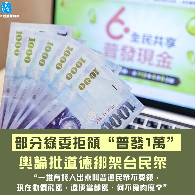 香港新聞網9月19日電 台當局早前決定向民眾普發現金1萬元(新台幣,下同),最快在10月開始發放,然而一些綠營官員、綠委表態不會領取,輿論質疑是道德綁架台灣民眾。台灣有網友表示,“現在物價飛漲,你不缺1萬,你當然可以不要領。”批評揚言不領的綠營官員等“何不食肉糜”!