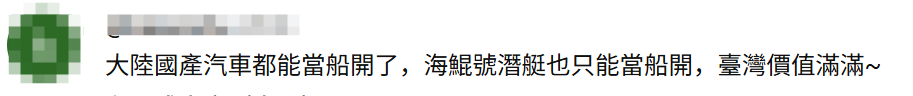 此外,還有人聯想到台灣自製潛艇“海鯤”號,耗資500億新台幣打造卻“不敢下潛”,不禁諷刺道:“大陸汽車都能當船開,‘海鯤’號也只能當船開。”