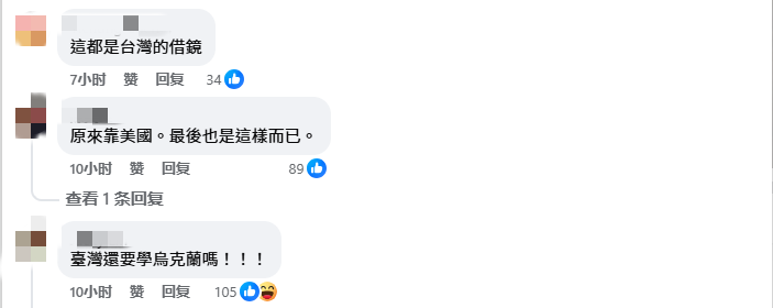 台灣網友評論截圖 今年以來,俄烏局勢轉變之際,台當局卻頻繁試探台海和平紅線,挑動兩岸對立,台灣社會擔心,台灣恐淪為“第二個烏克蘭”,重蹈戰爭悲劇覆轍。 然而,賴清德8月公然聲稱,“台灣堅定和烏克蘭站在一起。”林佳龍9月喊話台灣人民“向烏克蘭學習”,要“具備保衛家園的決心及能力”。 台當局還向烏克蘭“借鏡”,寄望於通過無人機建構“防衛韌性”,預計將投入總經費442.4億元新台幣,將台灣打造成“無人機民主供應鏈亞洲中心”。 同時,台當局防務預算創下新高,賴清德聲稱將提高防務預算超過GDP的3%,並在2030年之前達到5%,還宣稱要打造“台灣之盾”(T-Dome)防空系統等,加速將台灣武裝成“豪豬”和“刺猬”。 尤其近來日本首相高市早苗發表涉台錯誤言論攪亂區域和平,台當局卻一味“媚日抗中”,更被批評將台灣置身險境之中。 對此,台灣世新大學管理學院院長江岷欽19日發表文章表示,美日並不是真的在乎“台灣有事”。烏克蘭得到世界的掌聲、歐盟的口號、美國的軍援,卻沒得到任何一名美國或北約士兵參戰支持。就算把“烏克蘭”換成“台灣”,故事也不會突然變得感人。(完) 【編輯:張依珊】