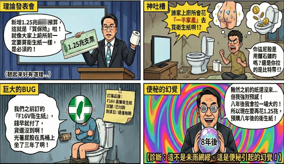 圖片來源:侯漢廷FB 昨日民進黨召開的記者會後,有媒體提問,國民黨質疑1.25萬億防務特別預算如此龐大,是否意味著戰爭會可能發生。徐國勇回應,國民黨這是“不正當連結”。他甚至以上厠所為比喻,“你總不能上完厠所才去買衛生紙”。 “現在是光著屁股在馬桶上坐了三年” 侯漢廷今日表示,誰家上廁所,會花1/3到1/2的家產去買衛生紙?屁股是用鑽石鑲的嗎?還是拉的是比特幣? 侯漢廷表示,買衛生紙,是為了擦屁股,對吧?但現在的情況是,台灣之前訂的F16V的“衛生紙”,錢付了,貨還沒到啊!現在是光著屁股在馬桶上坐了三年!他還酸,然後民進黨說“不行,雖然之前的紙還沒來,但我預感八年後我會拉一場大的,所以我現在要再花1.25萬億,預購八年後的衛生紙”,這不是未雨綢繆,這是便秘引起的幻覺。 侯漢廷指出,F16V是四代半戰機,但大陸六代機都出來了;五代機有全方位體系化作戰,看看印巴空戰,飛機看到飛機前就炸了。而“海鯤號”11月交艦跳票,坦克沒有反無人機設備。這是什麼意思?花大錢買iPhone10,但到貨時世界已經在玩iPhone18了!強化防衛?還是強化美國軍火商的年終獎金? 最後,侯漢廷批評,正常人發現,當衛生紙要用到1/2-1/3的家產,會思考有沒有其他的方式。 蔣萬安:比喻軍購有點奇怪 台北市長蔣萬安今天到北市議會接受市政總質詢,會前被媒體問到,怎麼看徐國勇把軍購比喻為衛生紙?蔣萬安回應,“我覺得有點奇怪”。 此外,台北市研考會今天公佈民調指,71.3%認為兩岸關係越緊張越要交流,64.1%台北市民支持持續和上海進行城市交流。蔣萬安表示,兩岸關係越困難越需要交流,雙城論壇也是目前兩岸之間,“少數、僅存、唯一溝通的管道”,會持續來努力。 柯志恩:不倫不類 又賣“芒果乾” 國民黨“立委”柯志恩今天也在臉書批評,徐國勇拿買衛生紙和防務預算混為一談、賣弄話術,只能說無比的莽撞與輕挑。以烏克蘭為例,沒有努力避戰嗎?沒有得到西方大力支持嗎?結果落入今日悲慘、屈辱的下場,反問:“台灣真要步上烏克蘭的後塵嗎?” 柯志恩示警,戰爭會毀掉一切,民進黨若為選舉利益,大賣“芒果乾”,把“備戰”當政治操作,她也拜託賴清德下次開講,能否告訴台灣人民“要不要兩岸和平?有沒有能力追求和平?”難道只有無止盡的砸錢在防務這一途嗎?更何況,多項軍購至今仍延宕、無法如期交貨,到底在備什麼戰、當局真把人民當傻瓜嗎?! 另外,有台灣胸腔科醫師也在臉書發文,痛批徐國勇“衛生紙遲到了4、5年,你的屁股都不難過嗎?不會癢嗎?更何況誰會用家裡一半的錢去買衛生紙?”他深深懷疑,買超貴的衛生紙,卻還沒到貨,根本是被詐騙了吧。 (完) 【編輯:紀東】
