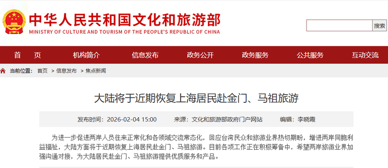 香港新聞網2月4日電 據中國文化和旅遊部4日消息,為進一步促進兩岸人員往來正常化和各領域交流常態化,回應台灣民眾和旅遊業界熱切期盼,增進兩岸同胞利益福祉,大陸方面將於近期恢復上海居民赴金門、馬祖旅遊。目前各項工作正在積極籌備中,希望兩岸旅遊業界加強溝通對接,為大陸居民赴金門、馬祖旅遊提供優質服務和產品。