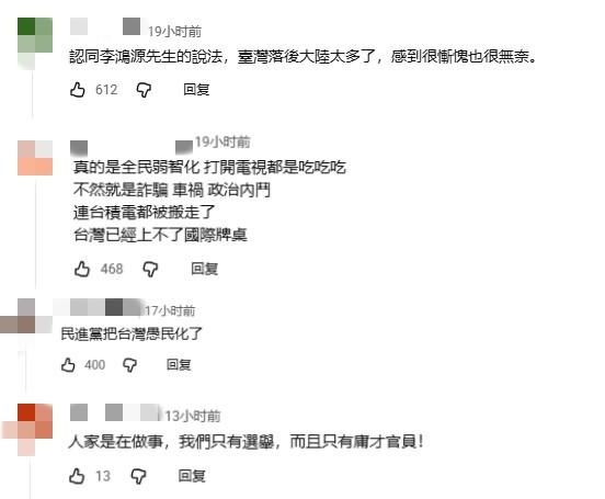 圖為台灣街頭。香港中通社資料圖片 4月16日,李鴻源在台媒節目上表示,此次訪陸,他自己印象深刻的是一些在大陸發展的台灣年輕人。李鴻源提到,這趟行程中,無論是在廈門航空、北京的國家大劇院,還是在上海的馬伯庸讀書會現場,他都遇見不少在當地發展的台灣年輕人。 比如,在國家大劇院的一場交響樂演出中,就有7位台灣樂手;上海讀書會現場也有6、7位30歲以下的台灣青年參與,有一名從事表演藝術的台灣女生告訴他:“我來這裡很快樂,我有地方表演,每個禮拜都可以去看很好的秀。”還有一名在上海創業的台灣年輕人,對方自述患有嚴重糖尿病,從小就知道自己“可能不會活太久”,最後卻在上海開了3家公司。 談到中關村一名從事AI精準投藥、打擊癌細胞的新技術研究的台灣背景博士時,李鴻源感慨道,這類人才之所以能在當地發展,關鍵在於大陸有一套系統化機制,能對優秀人才進行扶持,提供資金、協助孵化,相較之下,台灣沒有人在系統化做這件事情。 除了親眼見證台灣青年在大陸的發展機遇,李鴻源也對大陸公務人員的專業素養留下極深印象。此前在台灣“中天新聞”的網絡節目上,李鴻源也表示,大陸公務人員擁有熱忱、專業、務實等出眾的素質,“這樣高階的官員在台灣很難找到”,讓人不禁產生“很大的落差”,尤其回到台灣,打開電視後,全是“芝麻蒜皮的小事”。 李鴻源感嘆,在大陸全力培養人才、布局產業的同時,台灣卻長期沉溺於“小確幸”之中,在20多年間,將自身競爭力“消磨殆盡”。除了人才培育與扶持體系的差距,在前沿科技與產業發展上,兩岸的落差更為直觀,就拿低碳技術來說,“很遺憾的是,我們(台灣)連人家的車尾燈都看不見。” 李鴻源這番來自親身體驗的感慨,引發許多台灣網友的強烈共鳴:“台灣落後大陸太多了,感到很慚愧也很無奈。”“民進黨把台灣愚民化了。”“大陸的官在做事,台灣的官忙著選舉。”“民進黨的官沒一個是專業的,都是酬庸都是草包……”