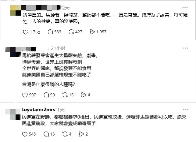 土豆。香港中通社資料圖片 日前多家台媒披露,根據台美“對等貿易協議”,如果發現進口土豆發芽腐爛,將進行“單顆剔除”後加工販售,而不再是整批直接退運。然而,台灣地區原先嚴格規定,海關發現一顆發芽土豆,就會整批退運。 圍繞發芽土豆的討論不斷發酵,而在台灣民眾常用的社媒平台上,日前還出現了不少聲稱“發芽土豆能吃”的帖子。有帖文稱,自己的丈夫是法國人,發芽的土豆也一樣會吃,“一點事情沒有。”有回覆也稱,自己的法國朋友覺得不能吃發芽的土豆“很荒謬”,還會拿這件事嘲笑自己。 台灣網絡也悄然形成一條“外國人吃發芽土豆”的“賽道”,陸續有帖文稱,韓國人、澳大利亞人、荷蘭人、意大利人……甚至美國人,也都會吃發芽的土豆。 根據台農業部門網站公告,綠皮或發芽土豆有致命毒素——茄鹼,也稱龍葵鹼(龍葵素),若不慎食用過量之茄鹼,可能導致頭暈、嘔吐、腹瀉等症狀。台灣林口長庚醫院臨床毒物中心主任顏宗海指出,少數發芽土豆所含的龍葵鹼極可能污染同批正常土豆,而民眾若不慎攝入龍葵鹼濃度達每公斤2至5毫克,便可能出現中毒症狀;濃度達每公斤3至6毫克,恐有致命風險。 但一條條標榜“冷知識”的帖文,還是讓不少不明情況的台灣網友感到困惑:“風向有點亂,所以土豆發芽後到底能不能吃?” 了解科學常識的台灣人則感到不解與憤怒。不少台灣網友質疑,在民進黨陷入開放“發芽土豆”入台的輿論漩渦時,網絡上卻出現大量“發芽土豆能吃”的帖文,很難不讓人產生政治聯想。 台灣網友直言:“土豆發芽就不能吃是常識。台當局為了舔美,每每犧牲台灣民眾的健康,真的沒底線。”“現在連發芽土豆都能洗白,青鳥到底要把我們禍害成怎樣才罷休?”“民進黨在野時就要求零檢出,執政後就連發芽土豆都能吃,大家是變成嗜毒高手了嗎?”