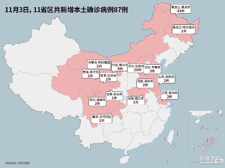 其中境外輸入病例17例(廣西5例,上海3例,廣東3例,雲南3例,吉林2例,山東1例),含1例由無症狀感染者轉為確診病例(在廣東);本土病例87例(黑龍江45例,其中黑河市44例、哈爾濱市1例;河北23例,其中石家莊市20例、辛集市3例;寧夏4例,均在銀川市;江蘇3例,均在常州市;河南3例,其中鄭州市2例、周口市1例;內蒙古2例,均在阿拉善盟;四川2例,均在成都市;甘肅2例,其中蘭州市1例、天水市1例;山東1例,在日照市;重慶1例,在沙坪壩區;青海1例,在西寧市),含2例由無症狀感染者轉為確診病例(山東1例,四川1例)。無新增死亡病例。新增疑似病例3例,均為境外輸入病例(均在上海)。 當日新增治愈出院病例24例,解除醫學觀察的密切接觸者2548人,重症病例較前一日減少1例。 境外輸入現有確診病例381例(其中重症病例2例),現有疑似病例4例。累計確診病例9687例,累計治愈出院病例9306例,無死亡病例。 截至11月3日24時,據31個省(自治區、直轄市)和新疆生產建設兵團報告,現有確診病例1080例(其中重症病例36例),累計治愈出院病例91811例,累計死亡病例4636例,累計報告確診病例97527例,現有疑似病例4例。累計追蹤到密切接觸者1266727人,尚在醫學觀察的密切接觸者41773人。 31個省(自治區、直轄市)和新疆生產建設兵團報告新增無症狀感染者31例,其中境外輸入15例,本土16例(河南6例,均在鄭州市;江西5例,均在上饒市;黑龍江1例,在哈爾濱市;江蘇1例,在常州市;浙江1例,在嘉興市;山東1例,在日照市;雲南1例,在德宏傣族景頗族自治州);當日轉為確診病例3例(境外輸入1例);當日解除醫學觀察6例(均為境外輸入);尚在醫學觀察的無症狀感染者406例(境外輸入343例)。 累計收到港澳台地區通報確診病例28857例。其中,香港特別行政區12352例(出院12034例,死亡213例),澳門特別行政區77例(出院75例),台灣地區16428例(出院13742例,死亡847例)。 【編輯:凌玉辉】