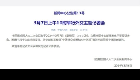 十三屆全國人大五次會議將舉行記者會(預計時間為3月7日下午),邀請國務委員兼外交部長王毅就“中國外交政策和對外關係”相關問題回答中外記者提問。