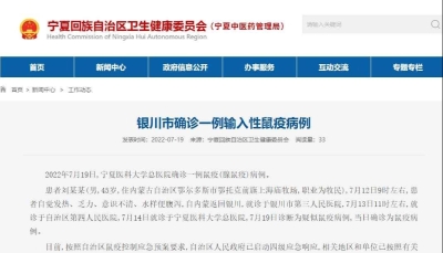 寧夏衛健委網站截圖 據寧夏自治區衛生健康委相關負責人介紹,該鼠疫確診患者為內蒙古自治區鄂爾多斯市鄂托克前旗上海廟牧場一位牧民,7月12日9時左右,患者自覺發熱、乏力、意識不清、水樣便腹瀉,自內蒙古返回銀川,就診於銀川市第三人民醫院,7月13日11時左右,就診於自治區第四人民醫院,7月14日就診於寧夏醫科大學總醫院,7月19日診斷為疑似鼠疫病例,當日確診為鼠疫病例。 寧夏自治區疾控中心鼠疫預防控制科科長張濤表示,鼠疫是由鼠疫耶爾森菌引起的自然疫源性疾病,是中國傳染病防治法規定的甲類傳染病,原發於鼠疫自然疫源地的野生嚙齒類動物之間,黃鼠、沙鼠、旱獺及其體表寄生蚤等是鼠疫的主要傳染源。初步判斷,該患者是在鼠疫自然疫源地感染。 鼠疫潛伏期一般為1至6天,個別病例可達8至9天。人感染鼠疫菌,臨床主要分為腺鼠疫、肺鼠疫及敗血型鼠疫等類型,其中腺鼠疫最為常見。除高熱及明顯的全身中毒症狀外,主要表現為局部淋巴結的腫大,如果早期發現及時治療,治癒率高。一旦被耽擱,極易繼發敗血症鼠疫。 據張濤介紹,當前,寧夏自治區政府已啟動四級應急響應,相關地區和單位已按照有關法律法規規定,全面啟動應急處置工作機制,對涉疫區域和人員採取嚴格的分類管控措施,各項處置工作正在有序推進。(完) 【編輯:凌玉辉】