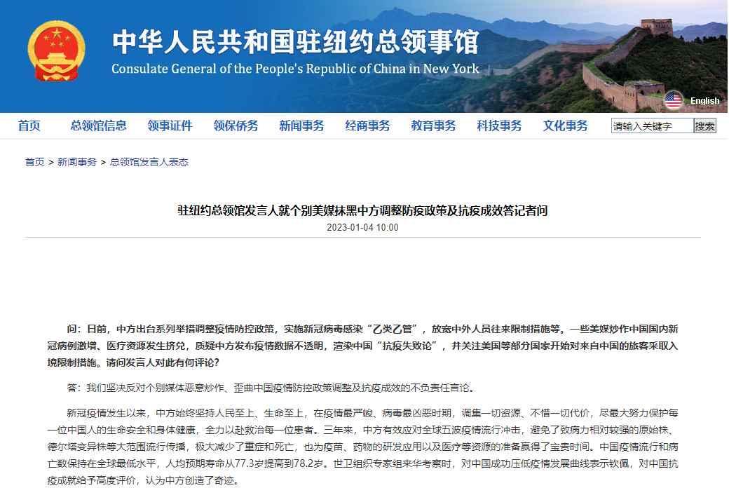 中國駐紐約總領館:堅決反對美媒抹黑中方調整防疫政策及抗疫成效香港新聞網1月5日電 據中國駐紐約總領館網站消息,1月4日,中國駐紐約總領館發言人就個別美媒抹黑中方調整防疫政策及抗疫成效答記者問。