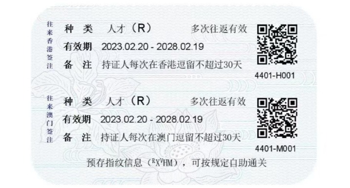 香港新聞網2月9日電 中華人民共和國出入境管理局2月9日發佈公告,為便利粵港澳大灣區人才從事科研學術交流活動,促進服務粵港澳大灣區建設發展,自2023年2月20日起在粵港澳大灣區內地城市試點實施往來港澳人才簽注政策。 根據該政策,在粵港澳大灣區工作的內地6類人才可以申辦往來港澳人才簽注,包括: 傑出人才,即對灣區建設發展作出重大突出貢獻或者灣區急需的頂尖人才; 科研人才,即灣區科研機構副高級以上職稱人員; 文教人才,即灣區高等院校副高級以上職稱人員; 衛健人才,即灣區副高級職稱以上衛生健康專業技術人才及衛生研究人才; 法律人才,即參與在香港、澳門法律仲裁程序的內地仲裁員,處理內地與香港、內地與澳門投資爭端的內地調解員等; 其他人才,即灣區人才、科技主管部門認定的高層次管理和專業技術人員。 上述6類人才可以根據實際需要,單獨或者同時申請辦理赴香港人才簽注和赴澳門人才簽注。其中傑出人才可以申辦有效期5年的人才簽注,科研、文教、衛健人才可以申辦有效期3年的人才簽注,法律、其他類人才可以申辦有效期1年的人才簽注。持證人在簽注有效期內可以不限次數往來香港或者澳門地區,每次在香港或者澳門停留不超過30天。傑出人才可以由本人向粵港澳大灣區任一縣級以上公安機關出入境管理機構提出申請,其他5類人才應由本人向工作所在地的縣級以上公安機關出入境管理機構提出申請。人才簽注的申請材料和申辦手續,可通過中華人民共和國出入境管理局、廣東省公安廳出入境管理局政府網站或者12367服務平台查詢。