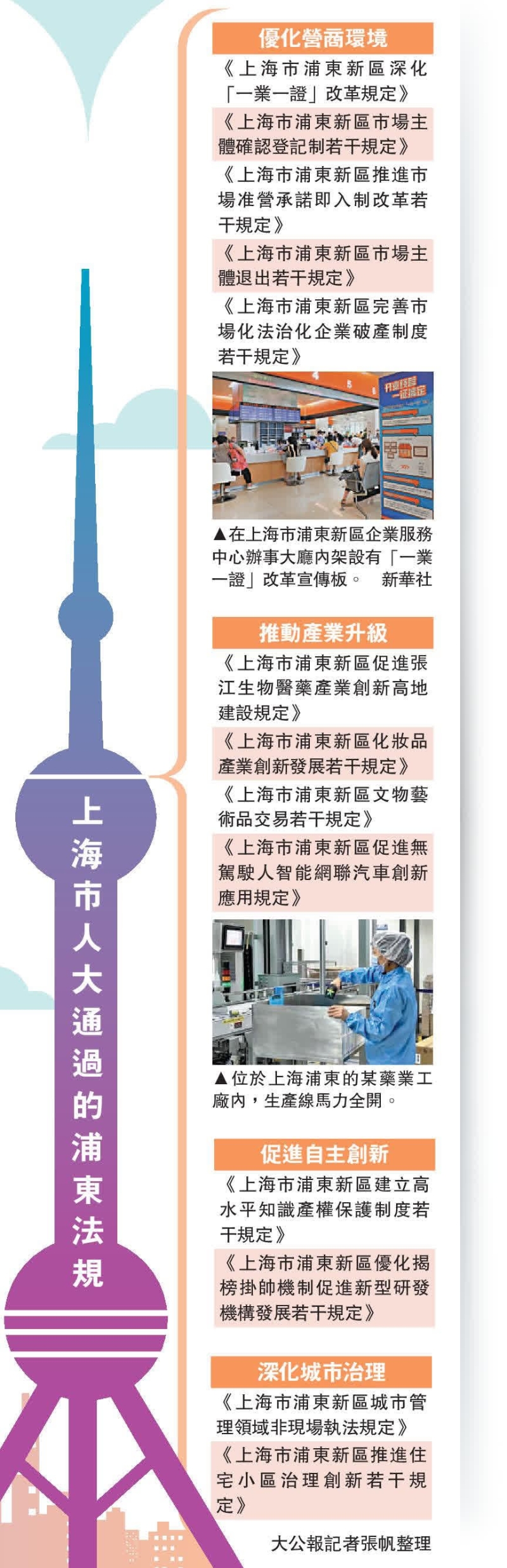 獨特立法權 浦東煥發新氣象 最近這一年多,漫步浦東,觸目所及也許還是那些樓,那些路。但深入其中卻會有很多新發現。 比如,走進某家小店喝杯咖啡,牆上再也找不到一大堆密密麻麻的證照,取而代之的是一張簡潔明瞭的《行業綜合許可證》,這是浦東率先探索“一業一證”改革的成果;來到金橋,說不定就會與駕駛座上沒有司機的汽車不期而遇,那是浦東開通國內首條中心城區L4級及以上自動駕駛開放測試道路,為全國乃至全球智能網聯汽車產業發展與智慧城市建設融合開展實踐性探索;路過張江,一定會發現這裏又多了不少國內外醫藥巨頭的研發中心和辦公樓…… 這些新氣象都源於一個強有力的支撐,那就是根據中央支持浦東打造現代化建設引領區的精神要求,全國人大常委會授予上海市人大常委會“制定浦東新區法規”的獨特立法權。 2021年7月,中共中央國務院《關於支持浦東新區高水平改革開放 打造社會主義現代化建設引領區的意見》賦予浦東新區改革開放新的重大任務,並要求建立完善與支持浦東大膽試、大膽闖、自主改相適應的法治保障體系。在《意見》發布前一個多月,全國人大常委會已作出《關於授權上海市人民代表大會及其常務委員會制定浦東新區法規的決定》。 上海市人大常委會法工委主任閻銳介紹,一年多來,上海將為浦東引領區建設提供堅實法治保障作為重要工作任務,截至目前先後出台15部浦東新區法規,立法主題涵蓋優化營商環境、推動產業升級、助力自主創新、服務綠色生態、深化城市治理等五大板塊。 積極破解制度創新難題 “選題既來自於《引領區意見》明確的改革事項,也體現了浦東‘排頭兵’和‘先行者’的戰略定位對法治建設的呼聲期盼,推動引領區在法治軌道上高質量發展。”閻銳說,15部法規在遵循憲法規定以及法律和行政法規基本原則的框架下,積極破解制度創新難題。其成效和示範作用已經初步顯現:立法引領營商環境進一步優化,立法助推產業發展進一步轉型升級,立法驅動創新活力進一步激發,立法助力綠色轉型發展水平進一步增強,立法助力城市治理效能進一步提升。 對於15部浦東新區法規的出台,上海市人大常委會相關人士認為,這是中央賦予上海改革開放極為重要的制度工具,具有巨大的制度優勢和制度潛力。首先是“創製性”,即為國家進行改革和制度試驗做探索;其次是“變通性”,依法變通國家法律法規,打通改革的制度瓶頸;另外還具有“突破性”,就是要“大膽試、大膽闖、自主改”,實現重大制度創新和制度變革。 將探索推出更多“促進法” “不過,這只是一個開端。”閻銳介紹,下一步將更加注重法規的貫徹實施,確保浦東新區法規的制度創新優勢轉化為高質量發展的治理效能;更加注重提高立法與改革的協調銜接,加強前瞻性謀劃、整體性布局,不斷提升制度設計的精準性和及時性。近期還擬圍繞標準制度型開放、金融市場發展、數據要素市場、生態環境保護等方面研究起草相關的浦東新區法規。 正在舉行的全國兩會期間,全國人大代表、上海市政府副秘書長、浦東新區區長杭迎偉在參與審議《政府工作報告》時也專門指出,浦東今年將持續強化法治保障,用足用好中央立法授權,建立完善與支持浦東大膽試、大膽闖、自主改相適應的法治保障體系,探索推出更多的“促進法”。 法治護航|立法保權益 萬商雲集近悅遠來 回顧歷史就會發現,“法治是基石”這句港人熟悉的話,同樣早已刻入浦東的基因。“正是有了法治保障,浦東才能開啟勇立潮頭、敢為人先的30年。”浦東開發親歷者、民建中央副主席周漢民曾對媒體表示。 周漢民至今記得,1990年陪同時任上海市領導訪美,當他們介紹國務院授予上海浦東開發的十項優惠政策時,立刻有人尖銳發問:“你們的十條優惠政策,印在報紙版面上只有巴掌大,如何才能吸引外資、讓外資放心?”市領導當場表態:“我們一定會立法,用法律來保障浦東開發開放以及外國投資者的權益。” 回國後,周漢民和同事們馬不停蹄地開展研究,不到2個月,9月10日,浦東開發開放的九項法規用中、英、日三種文字向世界公布,“讓世界感到浦東開發開放是動了真格、下了真功夫的,這才有浦東今天的萬商雲集,近悅遠來。” 法治引領伴隨着浦東發展的每一步。30多年來,數十件與浦東開發開放相關的地方性法規和法律性決定先後出台,浦東新區實現了重大改革於法有據,與國際通行規則銜接有法律支撐,改革攻堅有法治護航,改革成果有法規固化。“當人們稱讚一座城市、一個地區的時候,能夠用‘依法辦事’來形容,我認為這是很高的褒獎。”周漢民說。 他山之石|在滬港人:以立法引領推動改革創新 上海市政協港區委員、上海香港聯會主席張國正,已經在上海工作生活20多年。他現在的辦公室就位於浦東金橋。他時刻見證浦東的“成長”,不過令他最為讚嘆的,還是無形的進步。“今年2月,浦東又推出了法治保障專項行動,旨在用法治進一步優化營商環境,打造國際法律服務園,這會成為引領區未來發展的核心競爭力。” 張國正也非常關注全國人大賦予上海市人大的浦東立法權。令他印象最深的特點就是可以“變通”。他進一步指出,作為上海打造國際金融中心的重要承載區,浦東可以通過這些獨特的地方立法權助推上海更高水平的金融開放。他說,此前