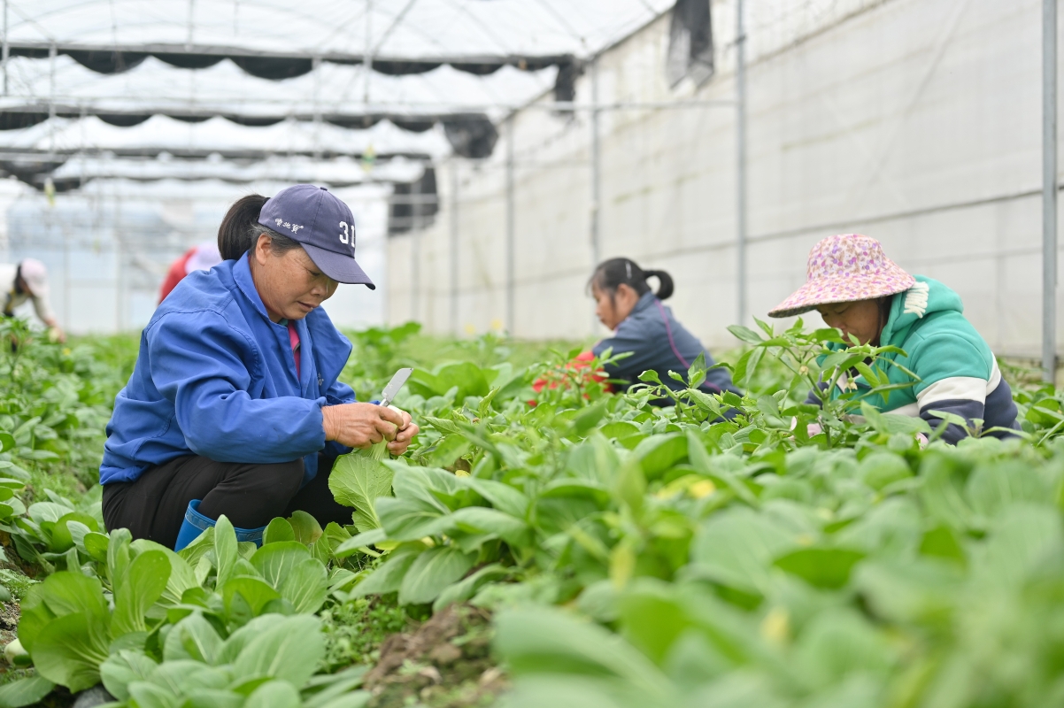 工作人員在賀州市八步區東融(供港)蔬菜基地採收蔬菜。俞靖 攝