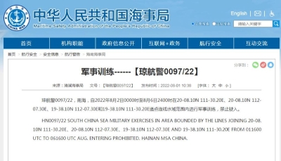 此前,4月17日,青島海事局宣布,18日9時到12時黃海展開重大軍事活動,期間船隻禁入。 上周,秦皇島海事局發布消息稱,4月17日至20日,渤海部分海域執行軍事任務,禁止駛入。葫蘆島海事局發布消息稱,4月15日,渤海北部部分海域進行軍事演習,禁止駛入。大連海事局發布消息稱,自4月16日,渤海海峽黃海北部部分海域執行軍事任務。 18日,廣東海事局發布航行警告,4月20日9時30分至15時,珠江口部分海域內將進行軍事演習。(完) 【編輯:丘志彬】