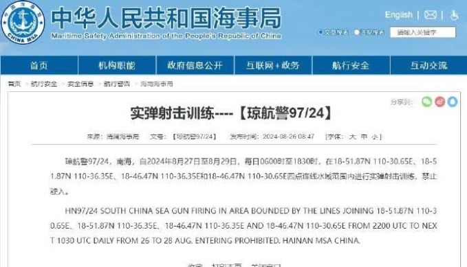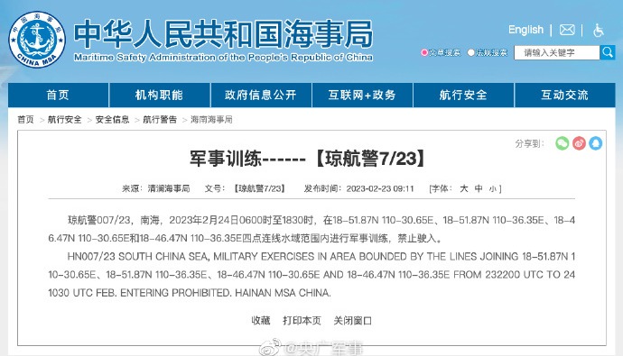 香港中通社4月20日電 據中國海事局網站消息,清瀾海事局發布航行警告,自4月21日18時至4月23日8時,南海部分海域進行軍事訓練,禁止駛入。