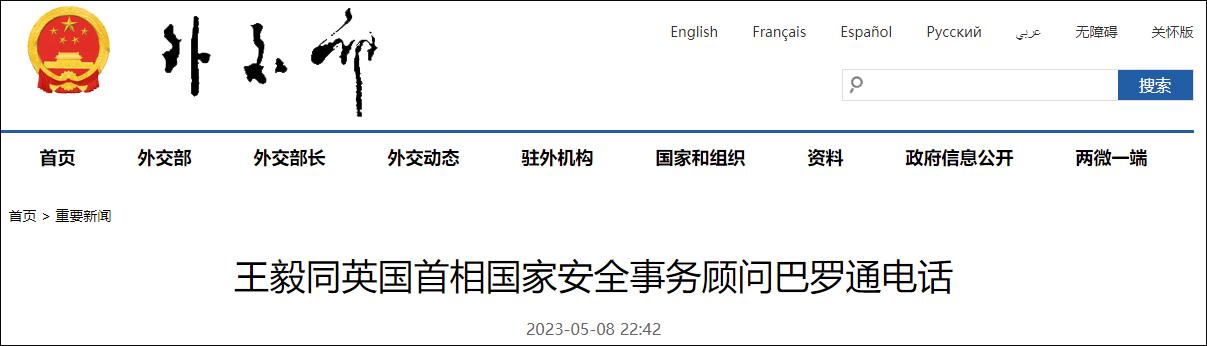香港新聞網5月9日電 據中國外交部網站消息,5月8日,中共中央政治局委員、中央外辦主任王毅應約同英國首相國家安全事務顧問巴羅通電話。