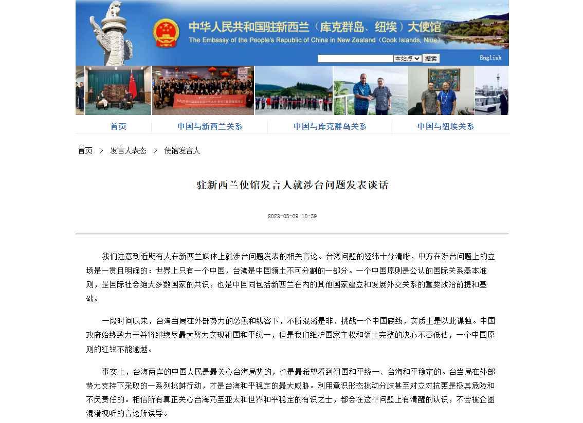香港新聞網5月9日電 9日,中國駐新西蘭使館發言人就涉台問題發表談話。