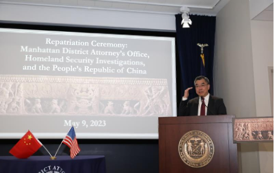 香港新聞網5月10日電 據中國駐紐約總領館微信公眾號消息,5月9日,經國家文物局授權,中國駐紐約總領事黃屏出席於紐約曼哈頓區檢察官辦公室舉行的中國流失文物返還儀式,與美方簽署返還協議,並接收2件重要石刻文物。