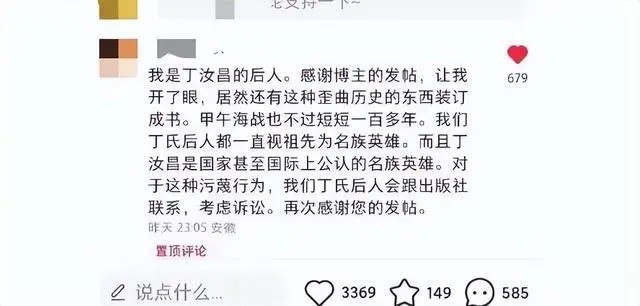 還有自稱“丁汝昌後人”的網友留言表示:丁氏後人會跟出版社聯繫,考慮訴訟。(中國青年報) 據悉,這幅所謂“丁汝昌投降圖”與《日清戰爭錦繪》中一幅題為“威海衛淪陷北洋艦隊提督丁汝昌投降之圖”的畫作高度相似。該組圖約繪製於1894至1895年,由當時眾多日本浮世繪畫師共同完成,以122幅的篇幅描繪了當時日本人眼中的甲午海戰。 丁汝昌(1836~1895年),安徽廬江縣石頭鎮人。清朝晚期將領,官至北洋水師提督。1894年,甲午戰爭爆發,丁汝昌指揮北洋水師與日軍展開黃海海戰,後艦隊退保威海衛。1895年,威海衛之戰中,丁汝昌率軍抗擊日軍圍攻。未得上峰命令,無奈港內待援,最後在彈盡糧絕、援軍未至的情況下,拒絕日軍將領伊東祐亨勸降,服食鴉片自盡以謝國人。(完) 【編輯:吳一帆】