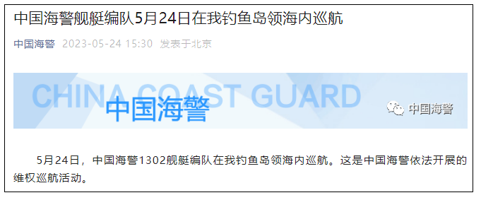 香港新聞網5月24日電 微信公眾號“中國海警”消息,5月24日,中國海警1302艦艇編隊在我釣魚島領海內巡航。這是中國海警依法開展的維權巡航活動。