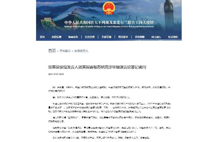 香港中通社6月10日電 中國駐英國使館發言人當地時間9日就前一日英國首相蘇納克訪美時稱中俄等國偷竊知識產權、濫用技術、操縱關鍵資源的言論回應表示,英方上述涉華言論純屬無中生有、信口雌黃、惡意詆毀。中方予以強烈譴責。