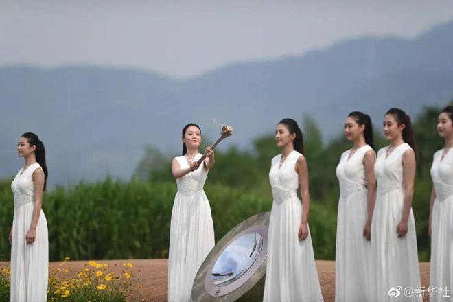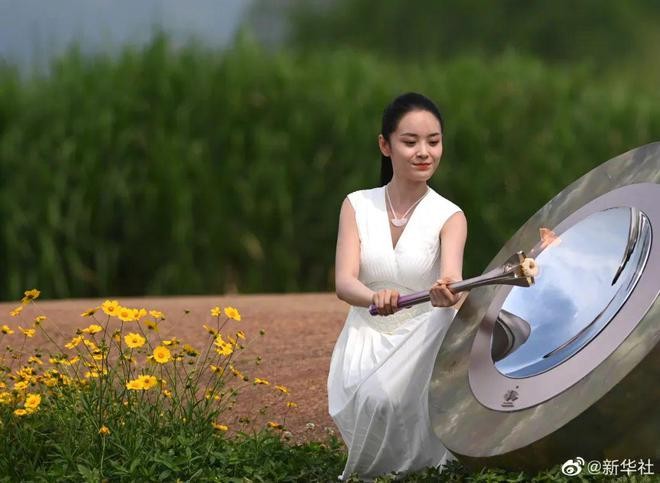 圖:新華社 初夏的良渚古城遺址,潺潺流水、呦呦鹿鳴,在大自然聲響譜寫的原生態交響中,19名身著白色服飾的採火使者緩步登上台階。“19”寓意第19屆亞運會。採火使者手持採火棒,走向採火裝置。裝置中心是一面凹面鏡,外圈採用良渚玉璧造型。採火使者將採火棒伸向採火裝置,成功點燃採火棒。