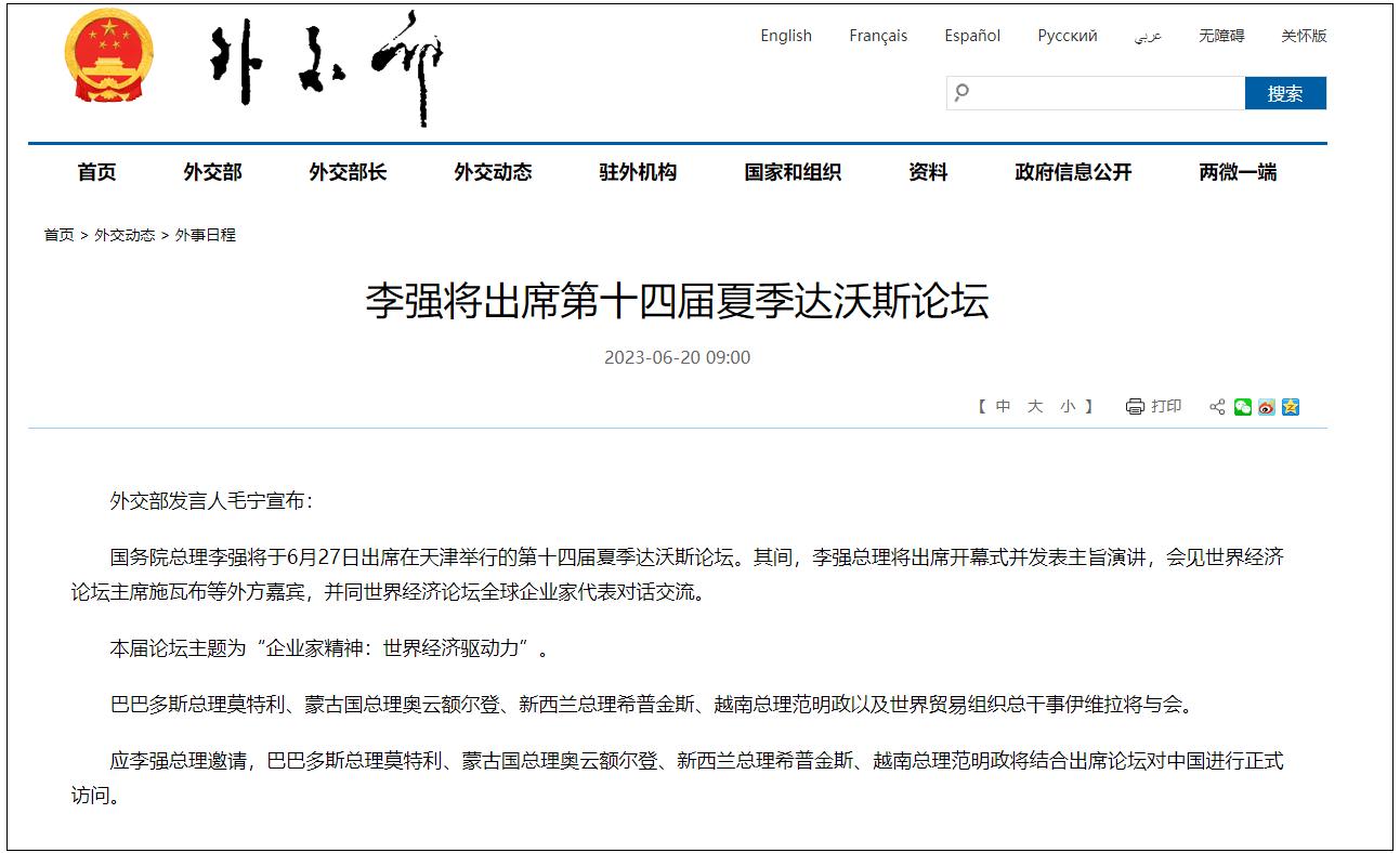 香港新聞網6月20日電 據中國外交部網站6月20日消息,外交部發言人毛寧宣布: 國務院總理李強將於6月27日出席在天津舉行的第十四屆夏季達沃斯論壇。其間,李強總理將出席開幕式並發表主旨演講,會見世界經濟論壇主席施瓦布等外方嘉賓,並同世界經濟論壇全球企業家代表對話交流。 本屆論壇主題為“企業家精神:世界經濟驅動力”。 巴巴多斯總理莫特利、蒙古國總理奧雲額爾登、新西蘭總理希普金斯、越南總理範明政以及世界貿易組織總幹事伊維拉將與會。 應李強總理邀請,巴巴多斯總理莫特利、蒙古國總理奧雲額爾登、新西蘭總理希普金斯、越南總理範明政將結合出席論壇對中國進行正式訪問。